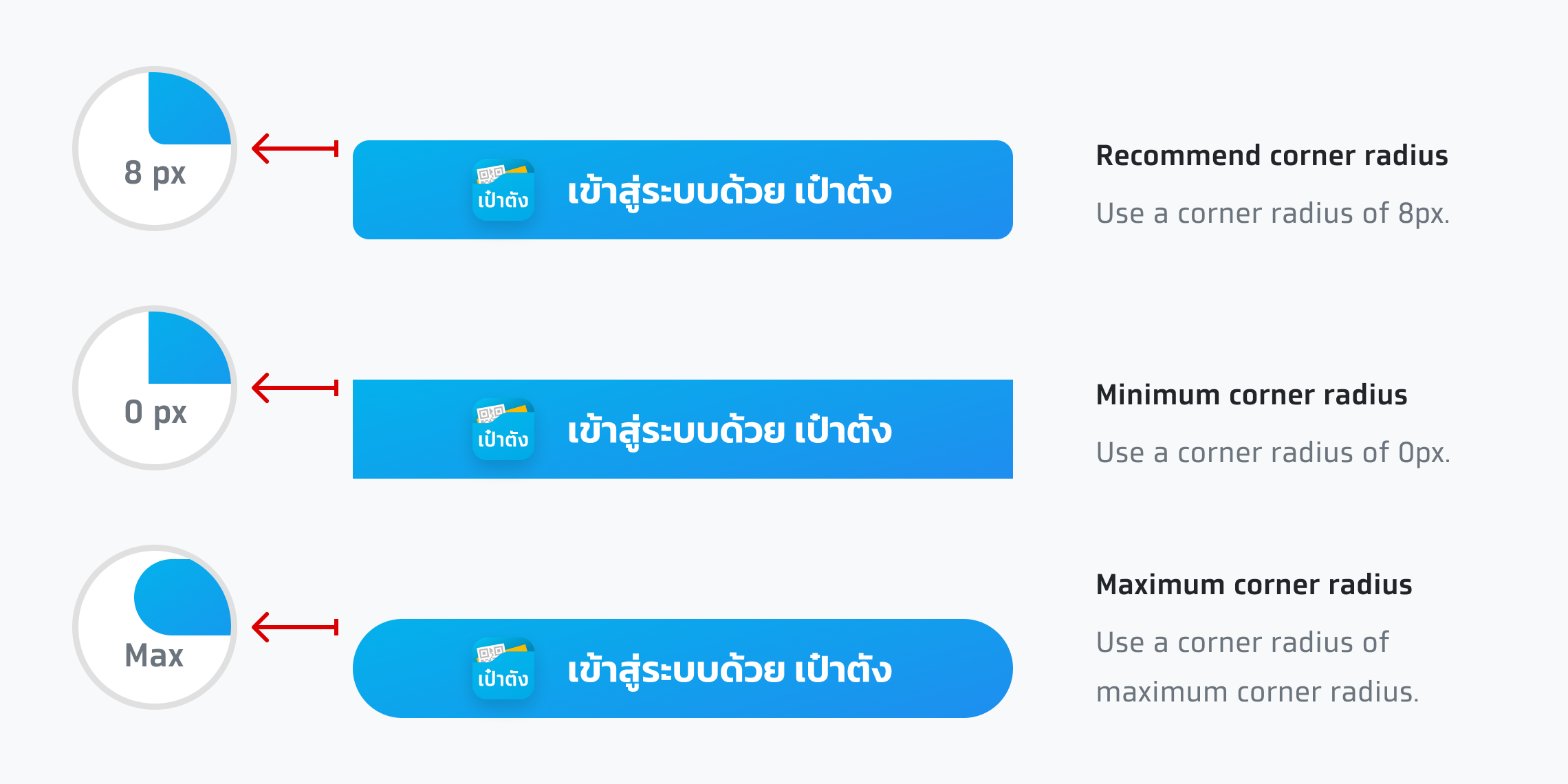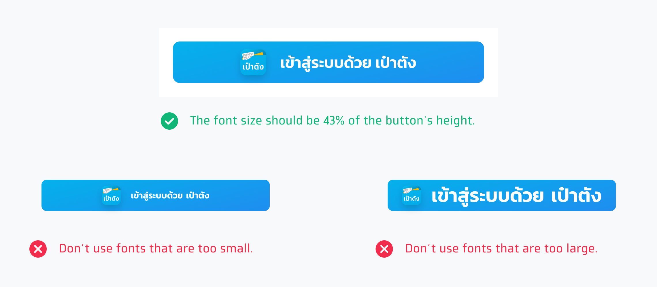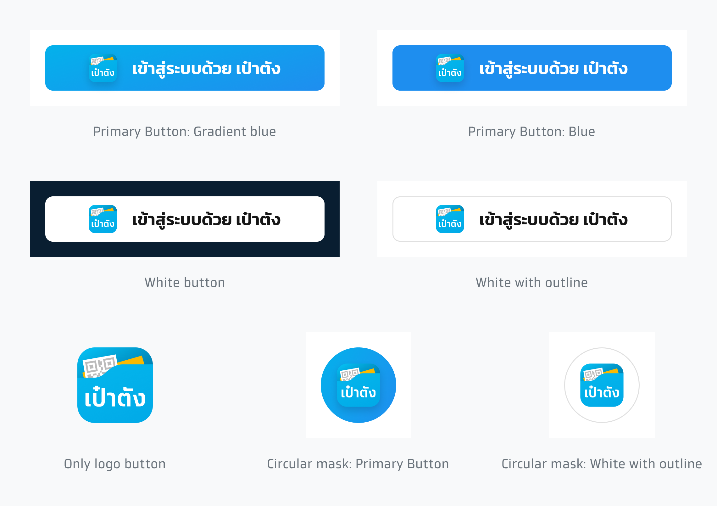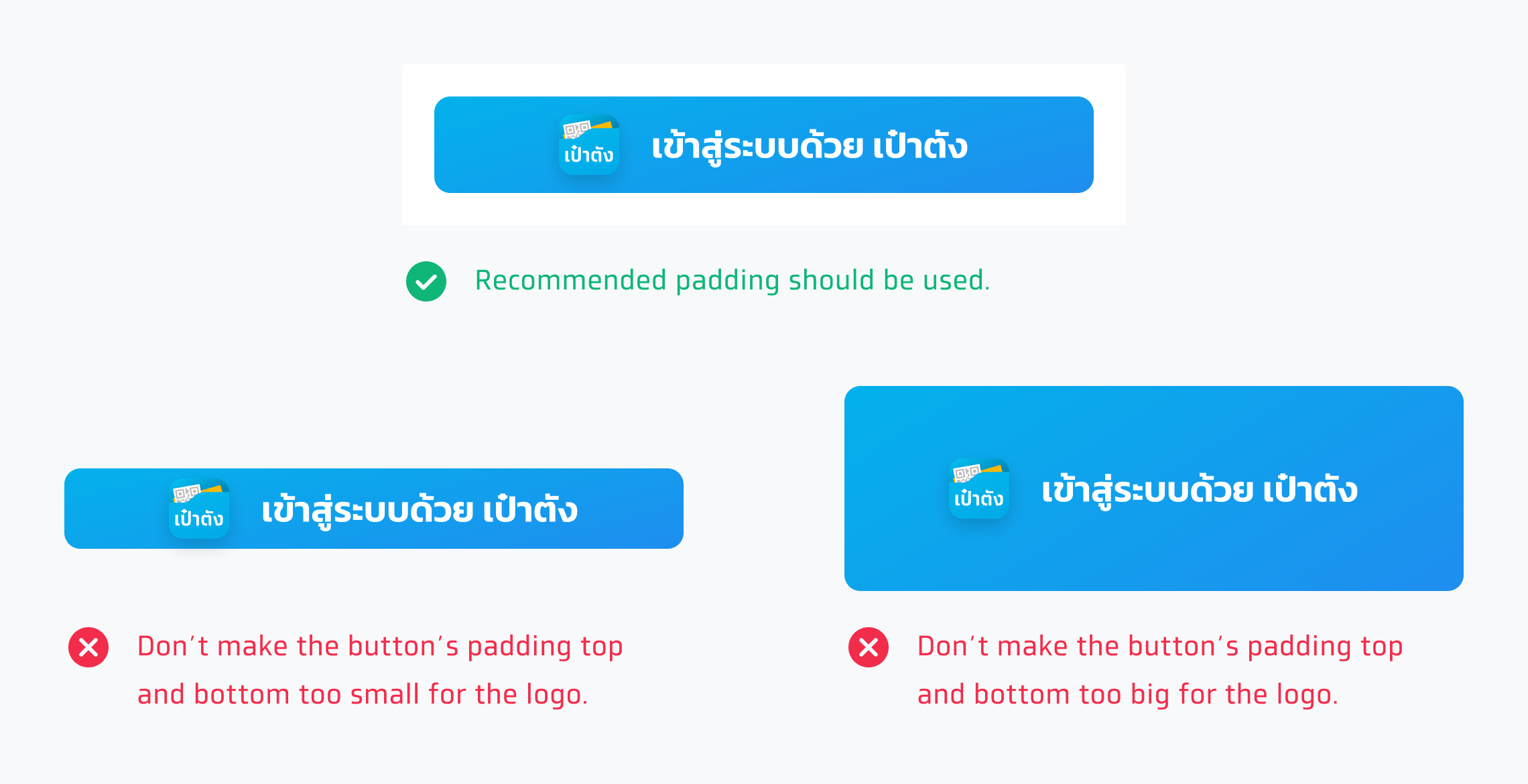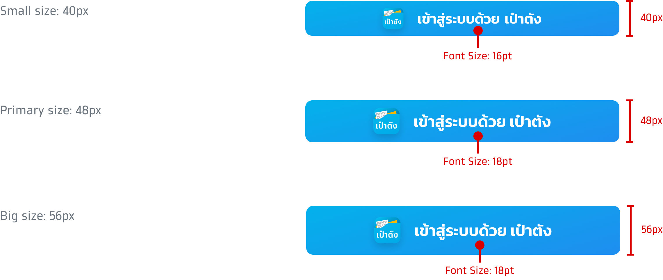 These are button sizes that are usually used in the application. The size and padding number are not fixed and can be adjusted to match with the appearance of other buttons. A logo-only ‘เข้าสู่ระบบด้วย เป๋าตัง’ button always has a 1:1 aspect ratio.
