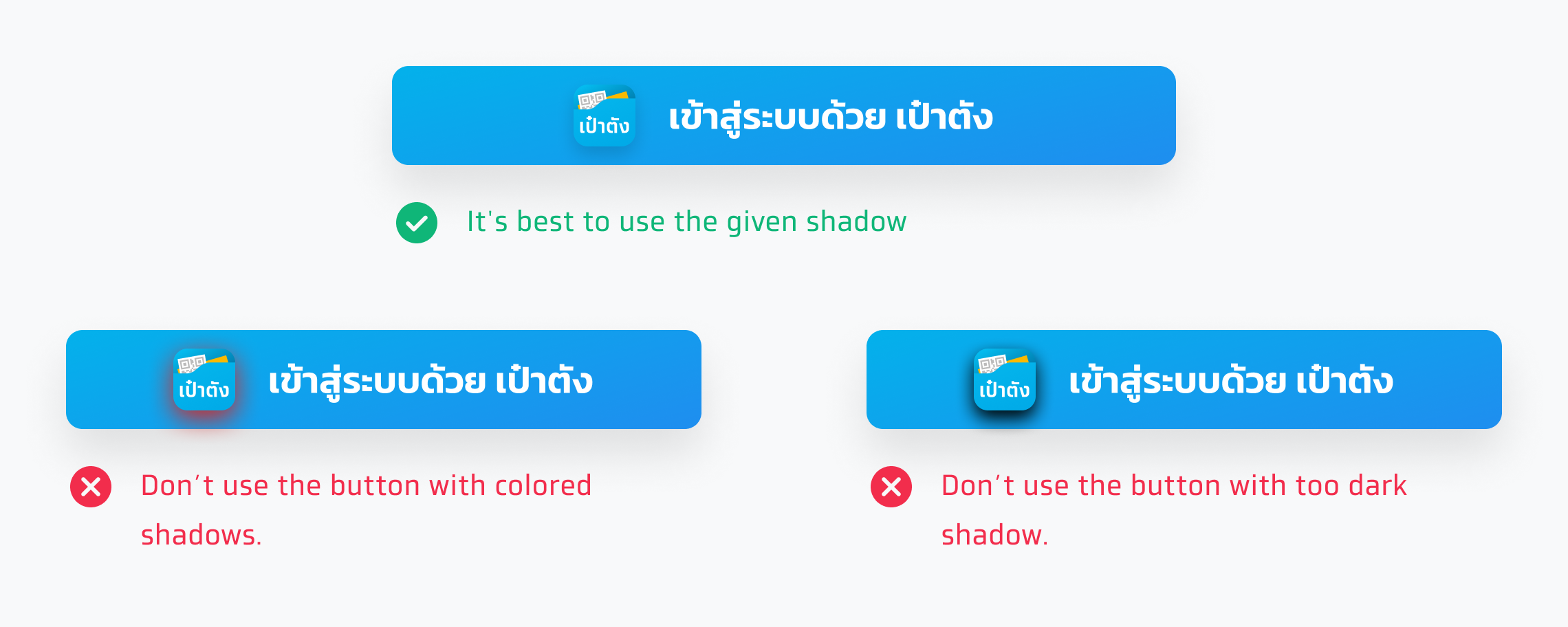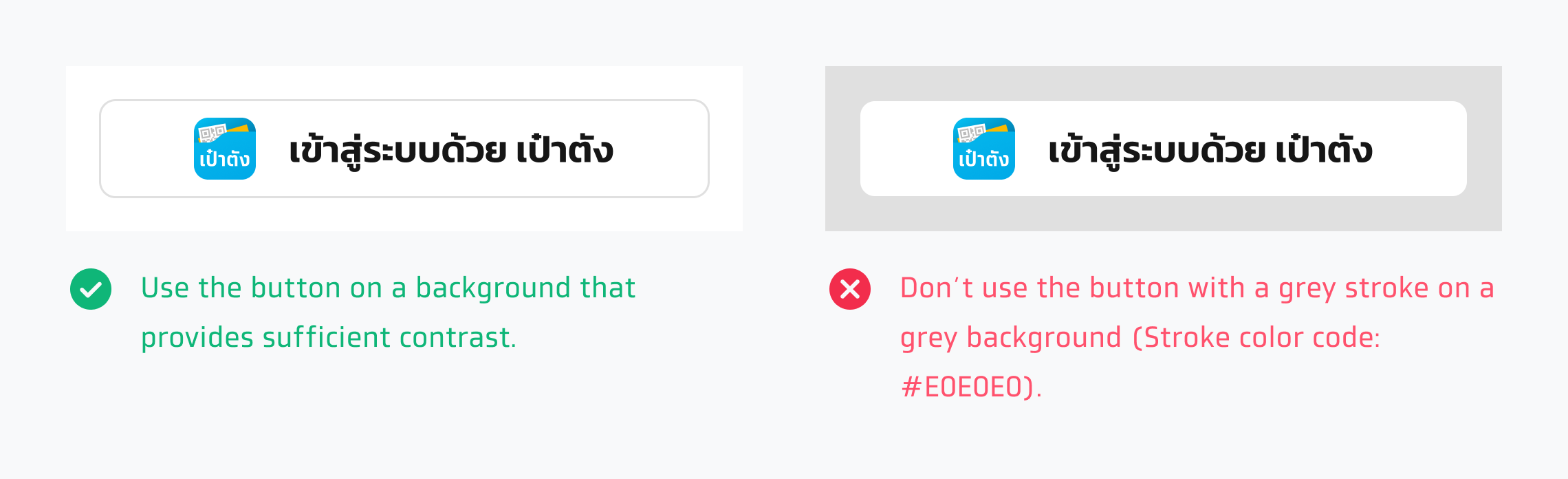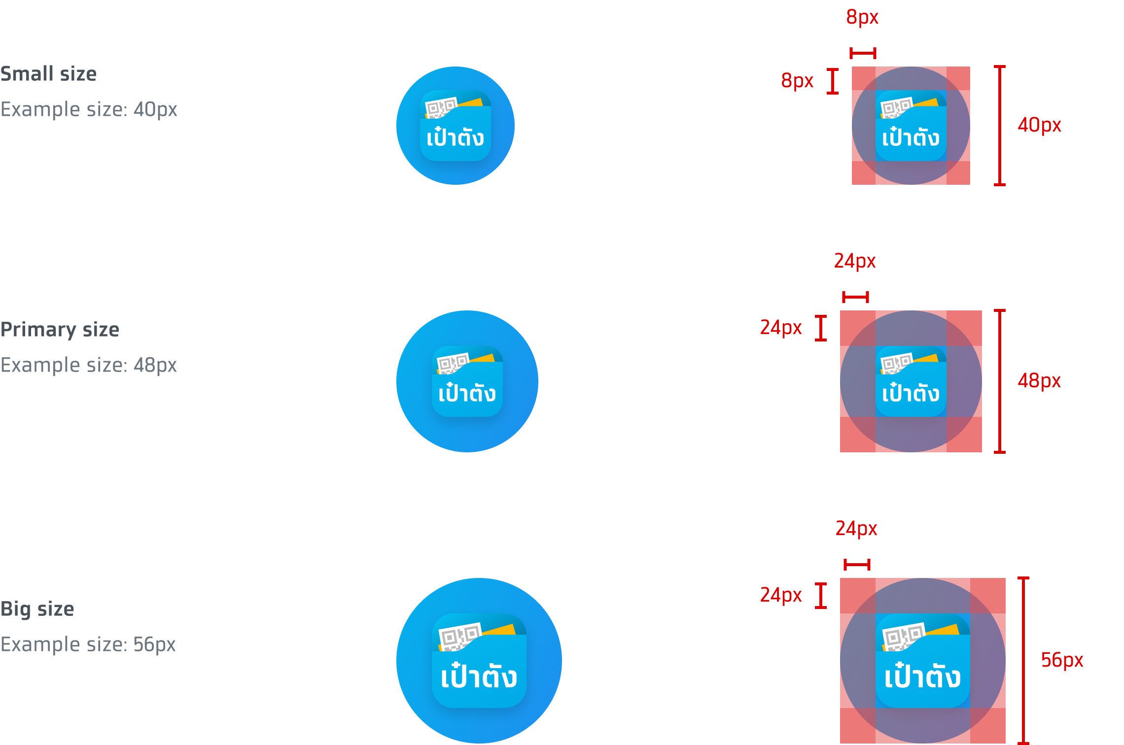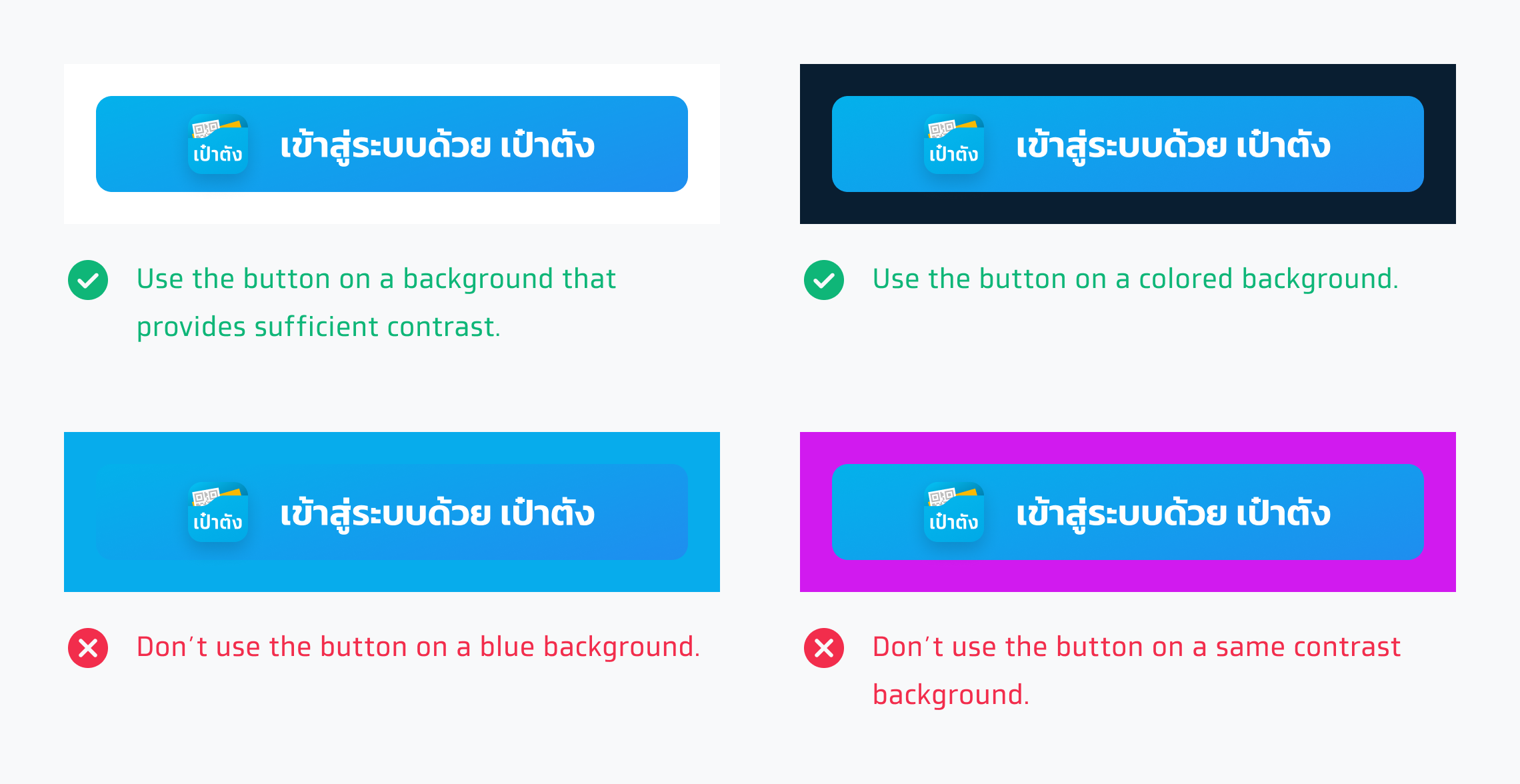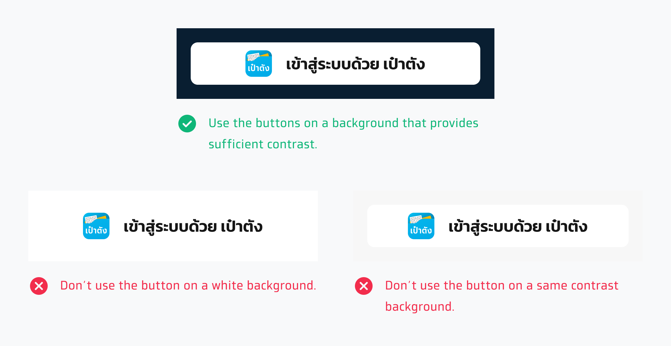 These are button sizes that are usually used in the application. The size and padding number are not fixed and can be adjusted to match with the appearance of other buttons. A logo-only ‘เข้าสู่ระบบด้วย เป๋าตัง’ button always has a 1:1 aspect ratio.